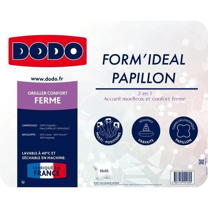 Oreiller Form’idéal Papillon – 55 X 55 Cm – Garnissage 100% Polyester Thermolite Résilience – Blanc – DODO